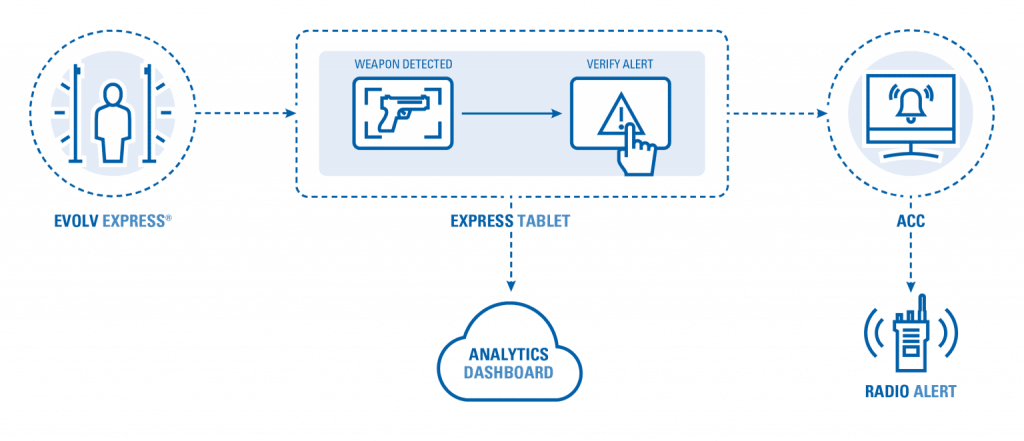 Evolv Express seamlessly screens up to 3,600 people per hour (60 per minute), eliminating any bottlenecks at points of entry. Unlike legacy metal detectors, wands, and pat downs, the system can intelligently distinguish between threats and everyday items like a cellphone, coins or keys.